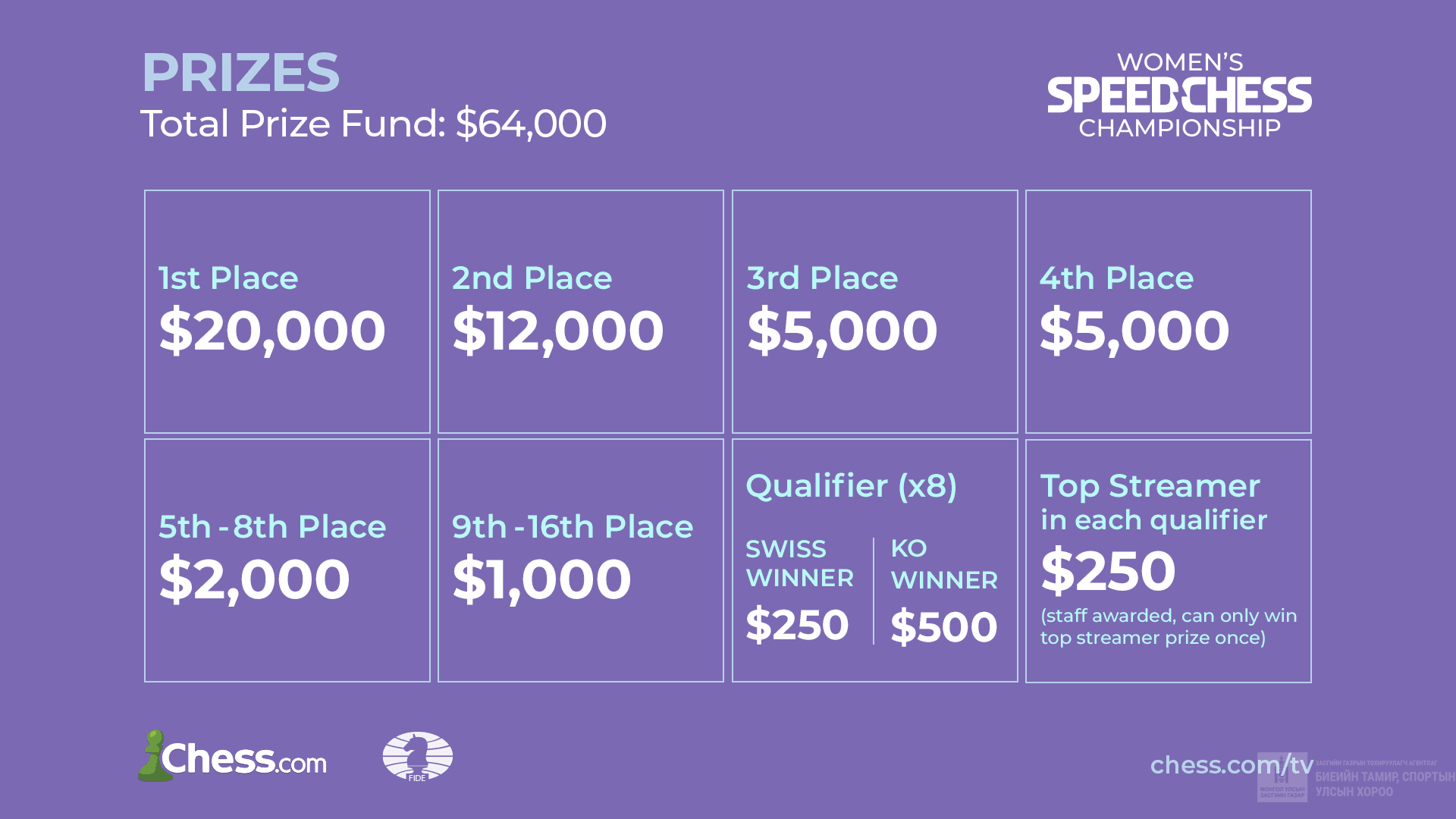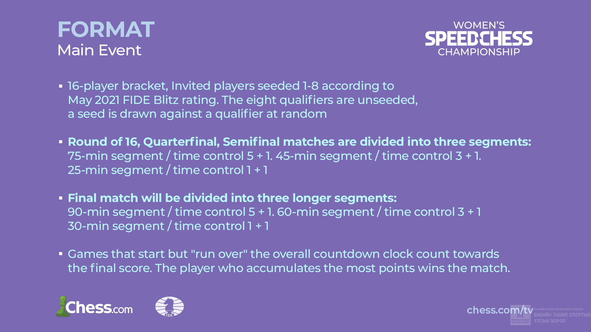 Дэлхийн Шатрын Холбоо болон Chess.com вэбсайтын хамтарсан Эмэгтэй Шатарчдын Хурдан Тоглолтын Аварга Шалгаруулах Тэмцээнийг 2021 оны 05-р сарын 28-наас 07-р сарын 03-ны хооронд зохион байгуулна. Тус тэмцээнд ДШХ-ны дэд мастер, мастер, ОУ-ын мастер, Их мастер цолтой эмэгтэй шатарчид бүгд оролцох эрхтэй.