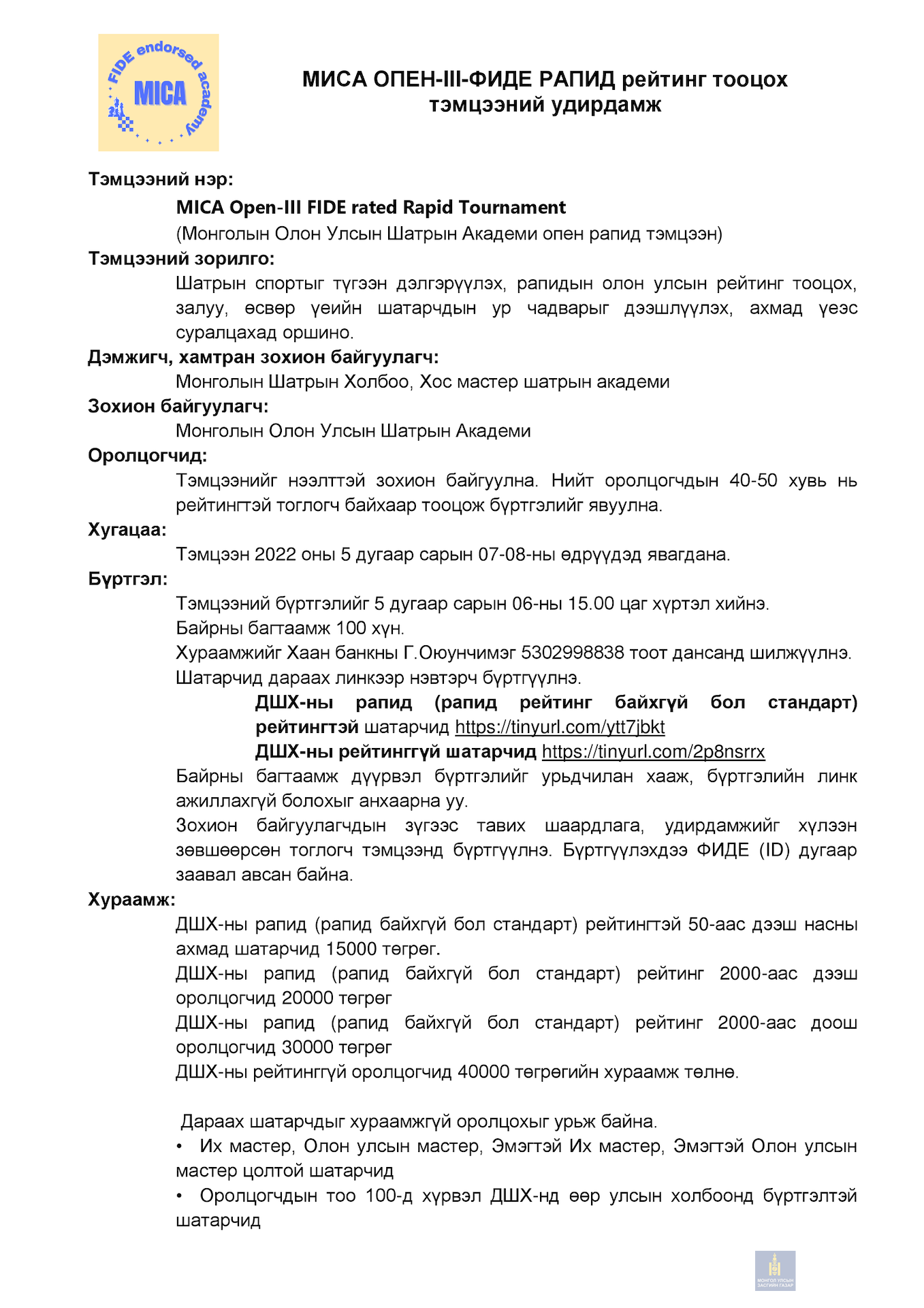 "Монголын олон улсын шатрын академи"-аас гадаад чансаа тооцох цуврал тэмцээнүүд зохион байгуулж байгаа бөгөөд гуравдугаар тэмцээн нь 2022.05.07-08 өдрүүдэд РАПИД төрлөөр "Хос мастер" шатрын академийн байранд зохиогдох ба нийт шатарчид та бүхнийг өргөнөөр оролцохыг урьж байна.