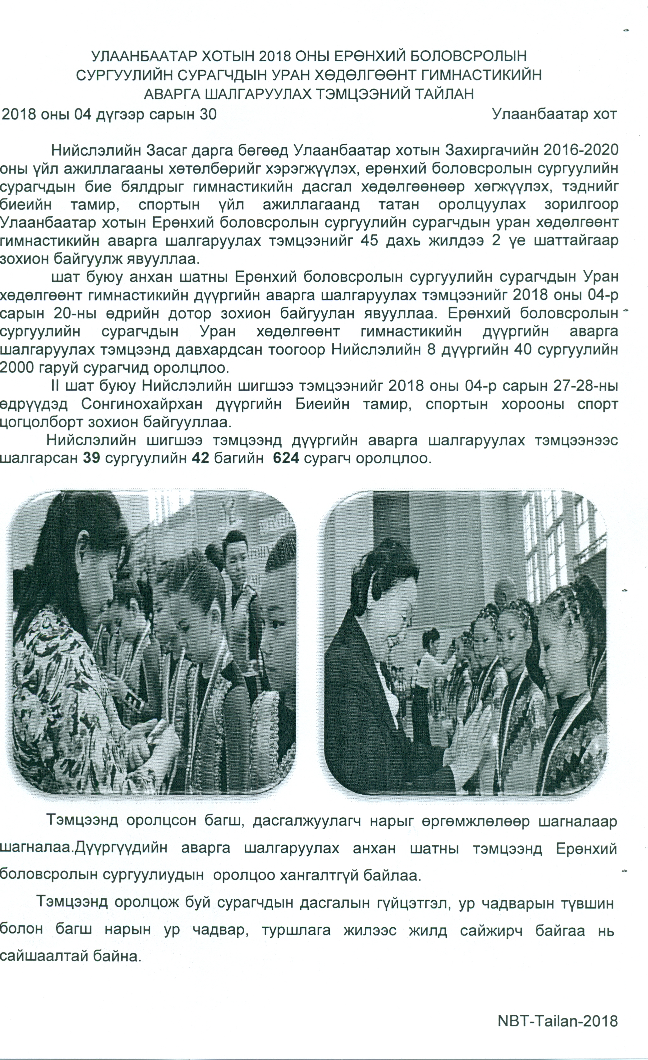 I шат буюу анхан шатны Ерөнхий боловсролын сургуулийн сурагчдын Уран хөдөлгөөнт гимнастикийн дүүргийн аваргашалгаруулах тэмцээнийг 2018 оны 04-р сарын 20-ны өдрийн дотор зохион байгуулан явууллаа. Ерөнхий боловсролын сургуулийн сурагчдын Уран хөдөлгөөнт гимнастикийндүүргийн аварга шалгаруулах тэмцээнд давхардсан тоогоор Нийслэлийн 8 дүүргийн 40 сургуулийн 2000 гаруй сурагчид оролцлоо.