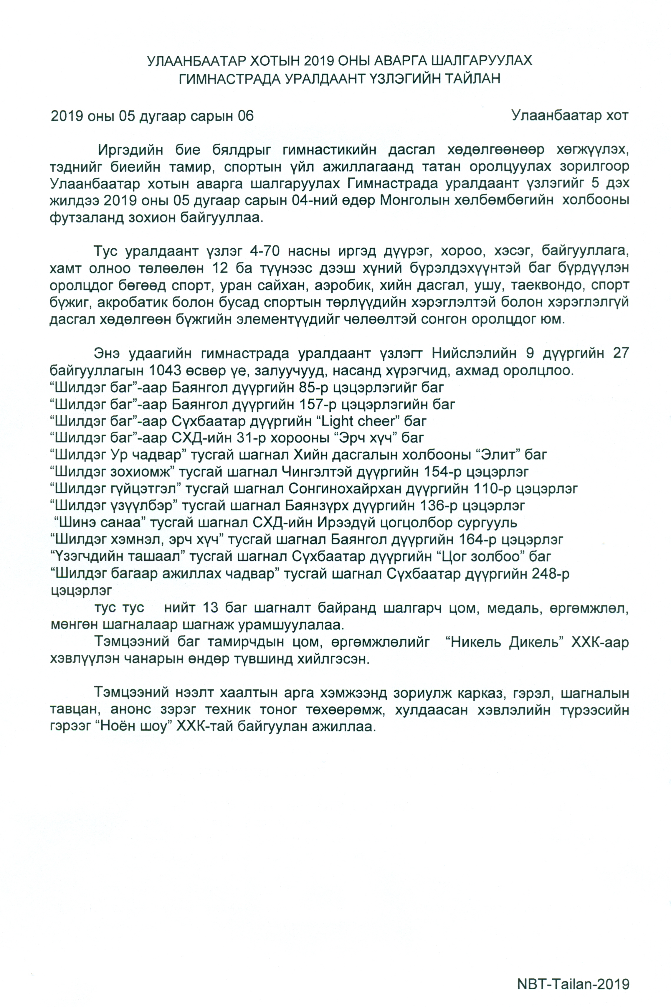 Иргэдийнбие бялдрыг гимнастикийн дасгал хөдөлгөөнөөр хөгжүүлэх, тэднийг биеийн тамир,спортын үйл ажиллагаанд татан оролцуулах зорилгоор Улаанбаатар хотын аваргашалгаруулах Гимнастрада уралдаант үзлэгийг 5 дэх жилдээ 2019 оны 05 дугаар сарын 04-ний өдөр Монголынхөлбөмбөгийн холбооны футзаланд зохионбайгууллаа. Уралдаант үзлэг 4-70 насны иргэд дүүрэг, хороо, хэсэг, байгууллага, хамт олноотөлөөлөн 12 ба түүнээс дээш хүний бүрэлдэхүүнтэй баг бүрдүүлэн оролцдог бөгөөдспорт, уран сайхан, аэробик, хийн дасгал, ушу, таеквондо, спорт бүжиг,акробатик болон бусад спортын төрлүүдийн хэрэглэлтэй болон хэрэглэлгүй дасгал хөдөлгөөн бүжгийн элементүүдийг чөлөөлтэйсонгон оролцдог.