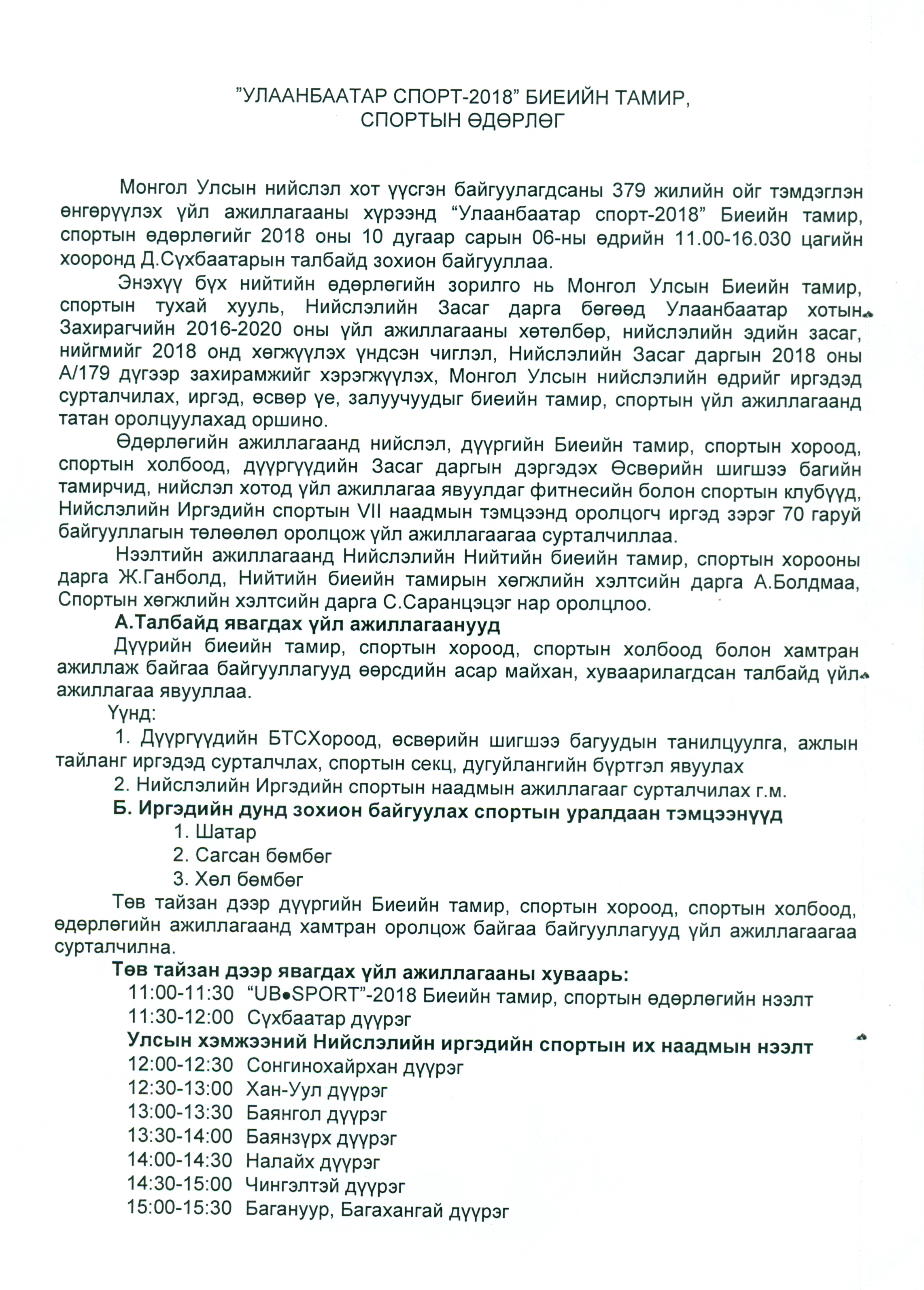 Монгол Улсын нийслэл хот үүсгэн байгуулагдсаны 379 жилийн ойг тэмдэглэнөнгөрүүлэх үйл ажиллагааны хүрээнд “Улаанбаатарспорт-2018” Биеийн тамир, спортын өдөрлөгийг 2018 оны 10 дугаар сарын 06-ныөдрийн 11.00-16.030 цагийн хооронд Д.Сүхбаатарын талбайд зохион байгууллаа.