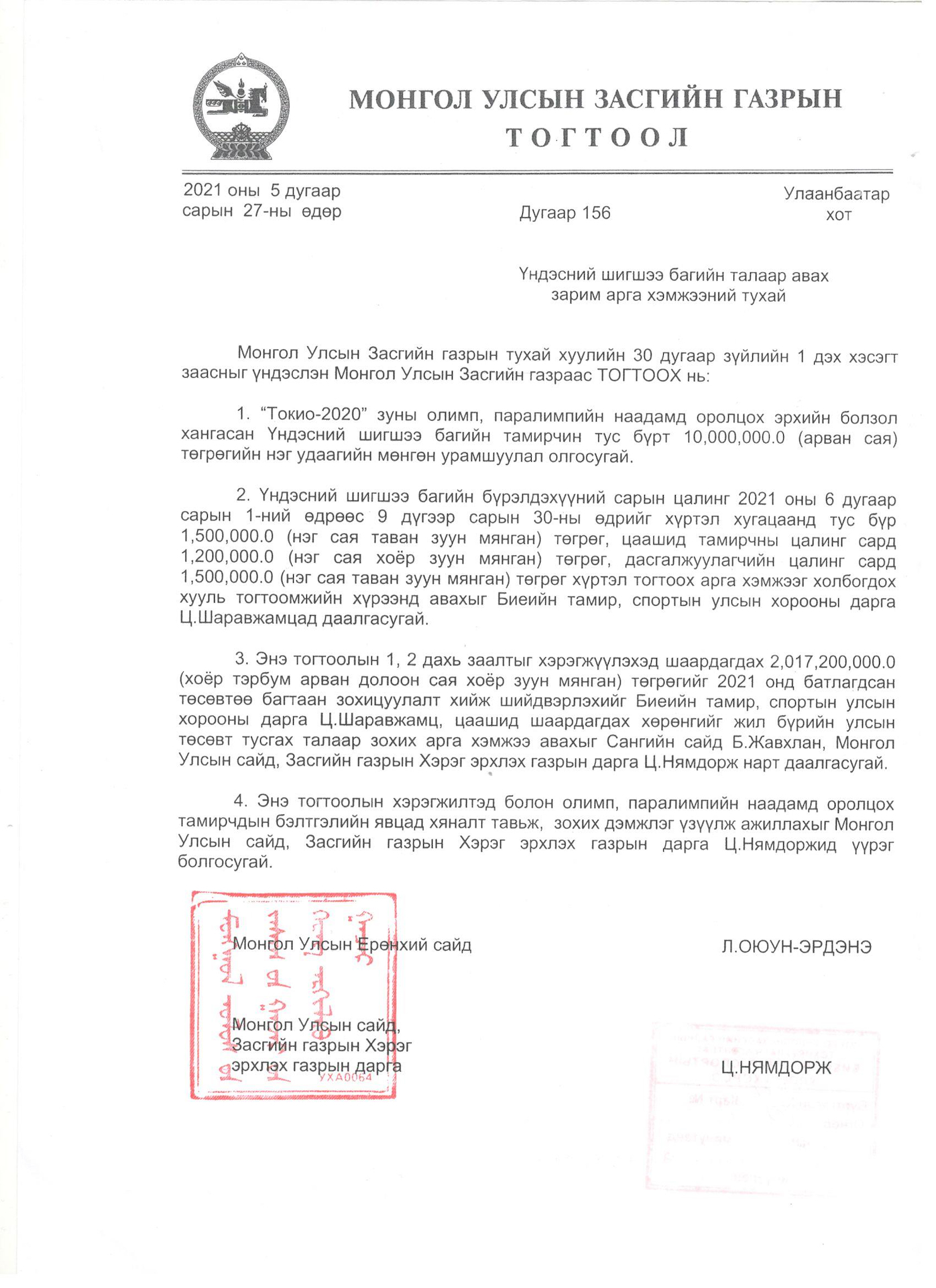 Монгол Улсын Засгийн газрын тогтоол "2021 оны 5 дугаар сарын 27-ны өдөр Дугаар 156"