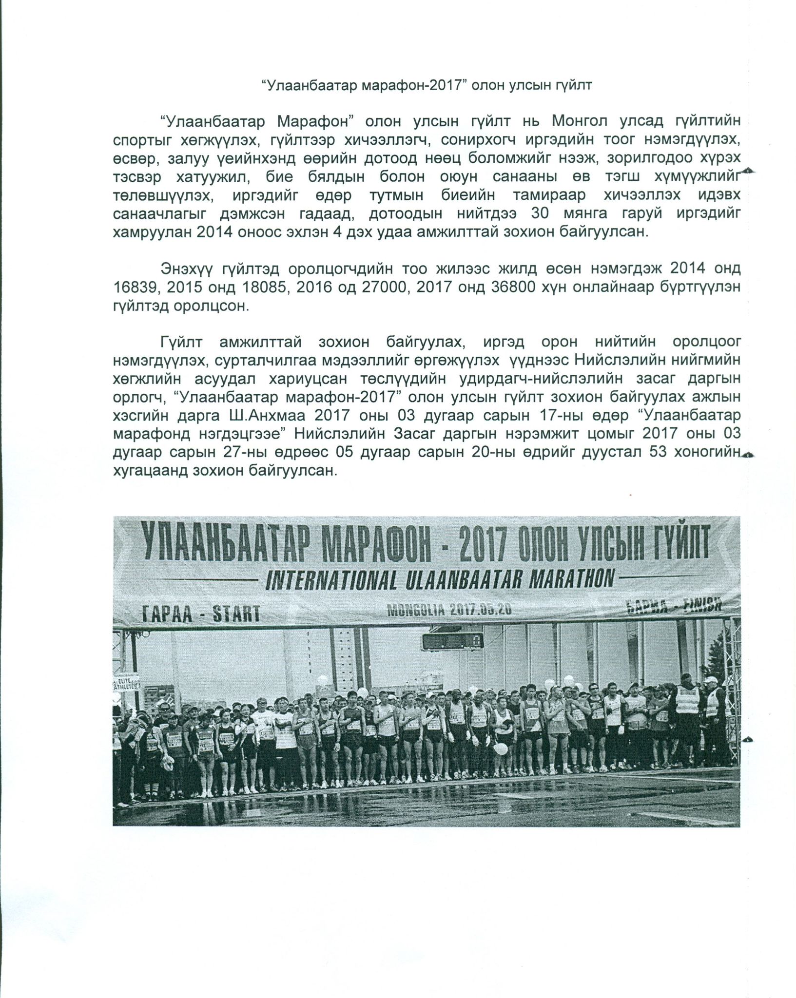 “УлаанбаатарМарафон - 2017” олон улсын гүйлтэд оролцогчдыг онлайн www.ub-marathon.ub.gov.mn сайтаар бүртгэн Нийслэл, дүүргийн Биеийн тамир, спортын хороонымэргэжилтнүүд хариуцсан баталгаажуулж хяналт тавьж ажилласан.
