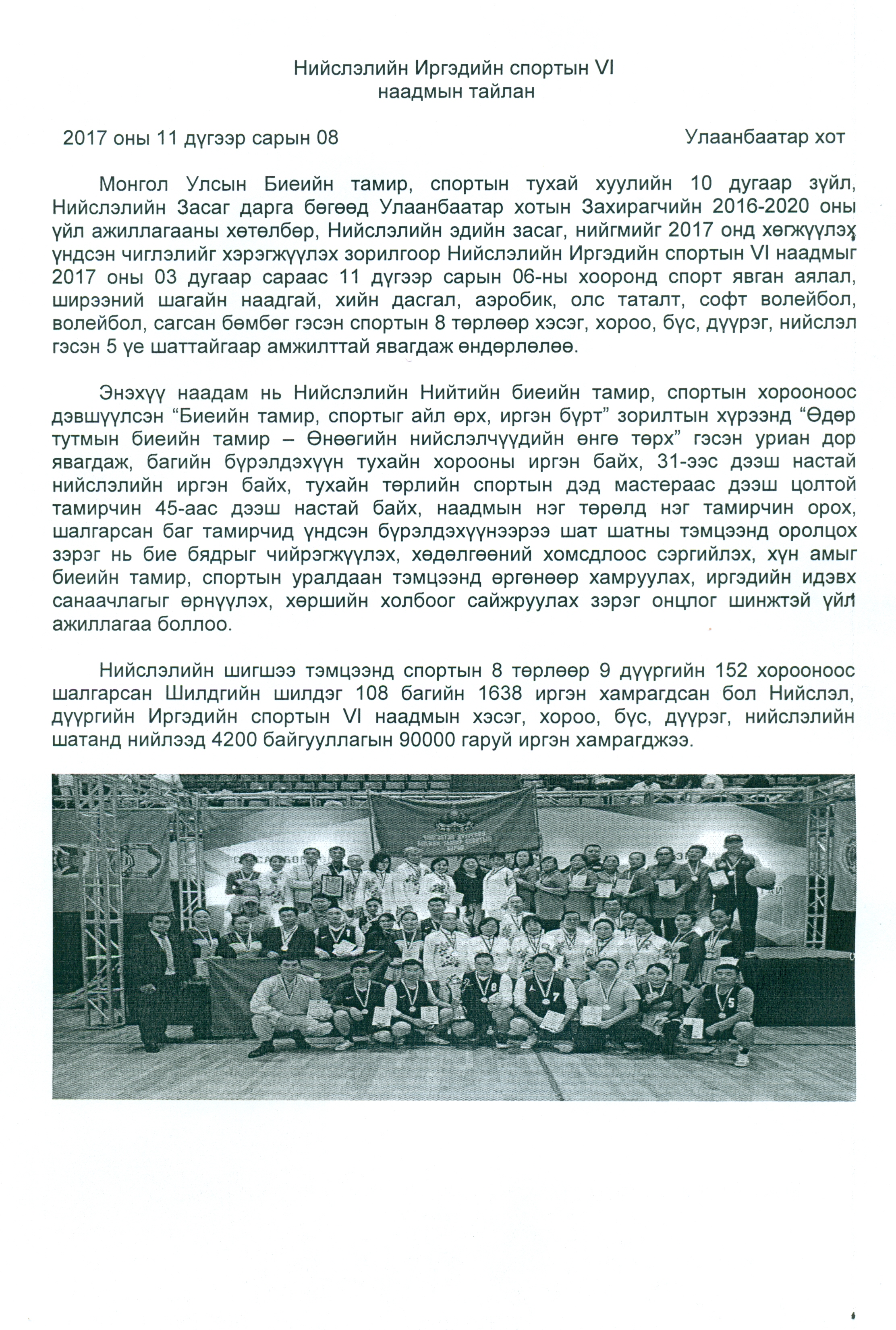 Монгол Улсын Биеийн тамир, спортын тухай хуулийн 10 дугаар зүйл, НийслэлийнЗасаг дарга бөгөөд Улаанбаатар хотын Захирагчийн 2016-2020 оны үйл ажиллагааныхөтөлбөр, Нийслэлийн эдийн засаг, нийгмийг 2017 онд хөгжүүлэх үндсэн чиглэлийг хэрэгжүүлэхзорилгоор Нийслэлийн Иргэдийн спортын VI наадмыг 2017 оны 03 дугаар сараас 11дүгээр сарын 06-ны хооронд спорт явган аялал, ширээний шагайн наадгай, хийндасгал, аэробик, олс таталт, софт волейбол, волейбол, сагсан бөмбөг гэсэн спортын8 төрлөөр хэсэг, хороо, бүс, дүүрэг, нийслэл гэсэн 5 үе шаттайгаар амжилттайявагдаж өндөрлөлөө.