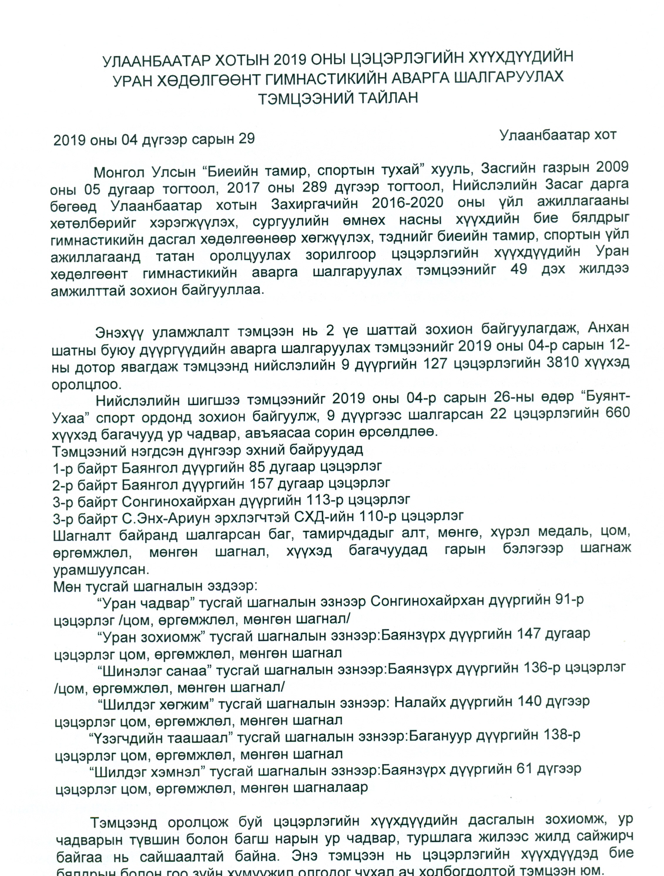 Сургуулийн өмнөх насны хүүхдийн бие бялдрыг гимнастикийндасгал хөдөлгөөнөөр хөгжүүлэх, тэднийг биеийн тамир, спортын үйл ажиллагаанд татан оролцуулах зорилгоор Улаанбаатар хотын аварга шалгаруулах цэцэрлэгийн хүүхдүүдийн уран хөдөлгөөнтгимнастикийн тэмцээнийг 2 үе шаттай зохионбайгуулж, анхан шатны буюу дүүргүүдийн аварга шалгаруулах тэмцээнийг 2019 оны 04-р сарын 12-ны дотор явагдаж тэмцээнд нийслэлийн 9 дүүргийн 127 цэцэрлэгийн 3810 хүүхэд оролцлоо.