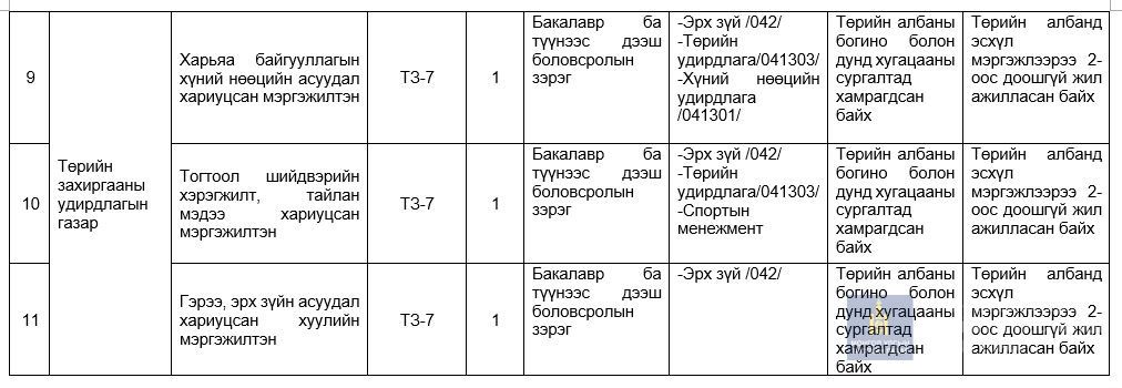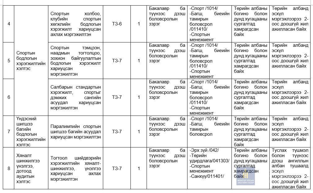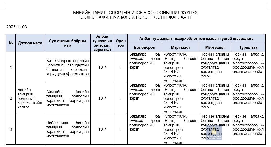 ✅Зарлагдсан сул орон тооны албан тушаалын тодорхойлолтод заасан тусгай шаардлагыг хангасан байх.