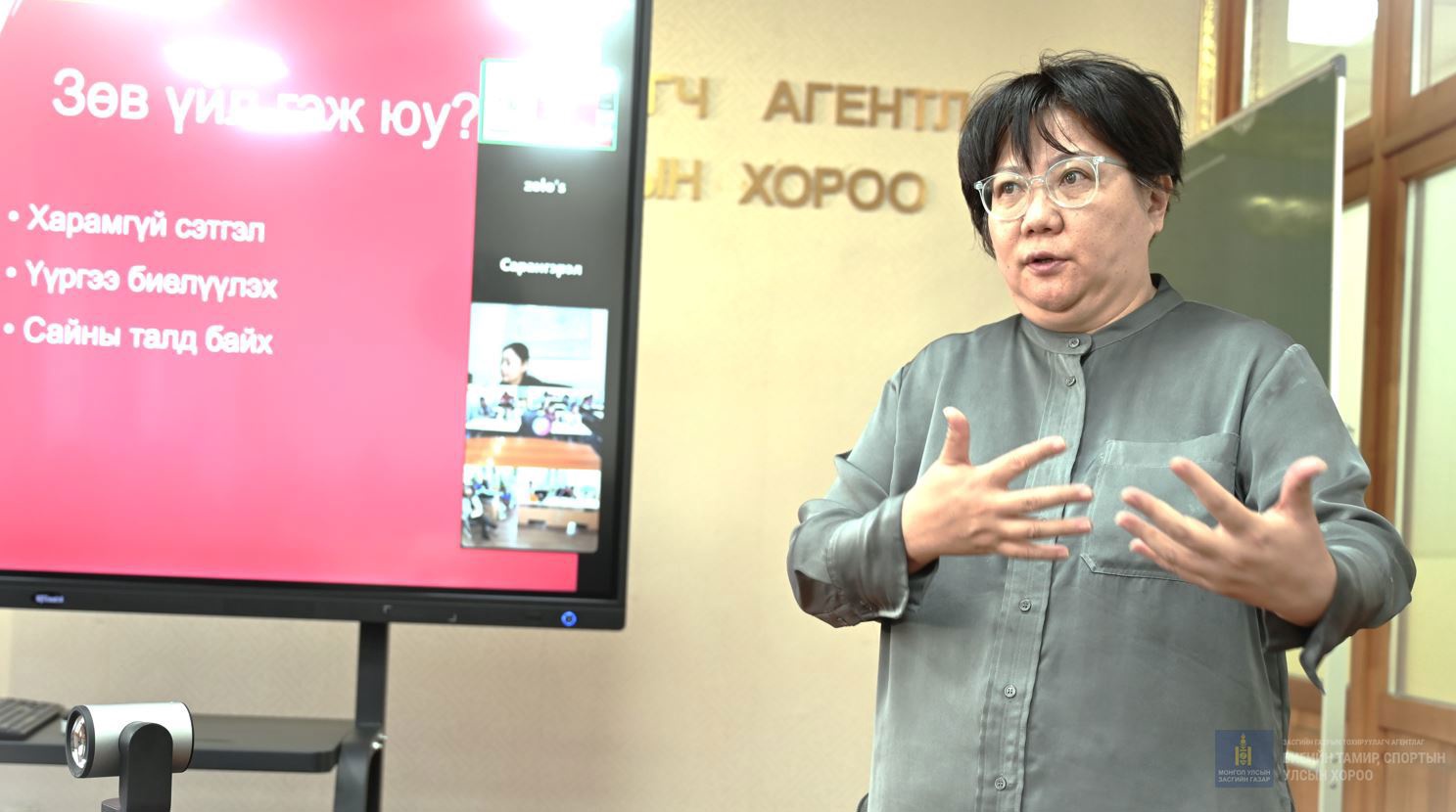 Сургалтыг харилцан ярилцах хэлбэрээр зохион байгуулсан. Энэхүүсургалт нь Засгийн газрын хяналт хэрэгжүүлэх газар, Төрийн албаны зөвлөл,Авлигатай тэмцэх газар Хүний эрхийн үндэсний комисс, Үндэсний аудитын газар мөнСоёл, спорт, аялал жуулчлал, залуучуудын яамны Хяналт-шинжилгээ, үнэлгээ,дотоод аудитын газар зэрэг байгууллагуудаас ирүүлсэн чиглэл, дүгнэлт,зөвлөмжийг хэрэгжүүлэн, илэрсэн зөрчил, алдаа дутагдлыг залруулж, цаашид давтангаргахгүй байх, урьдчилан сэргийлэх, албан хаагчдыг соён гэгээрүүлэх зорилготойюм.