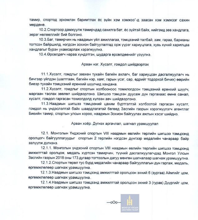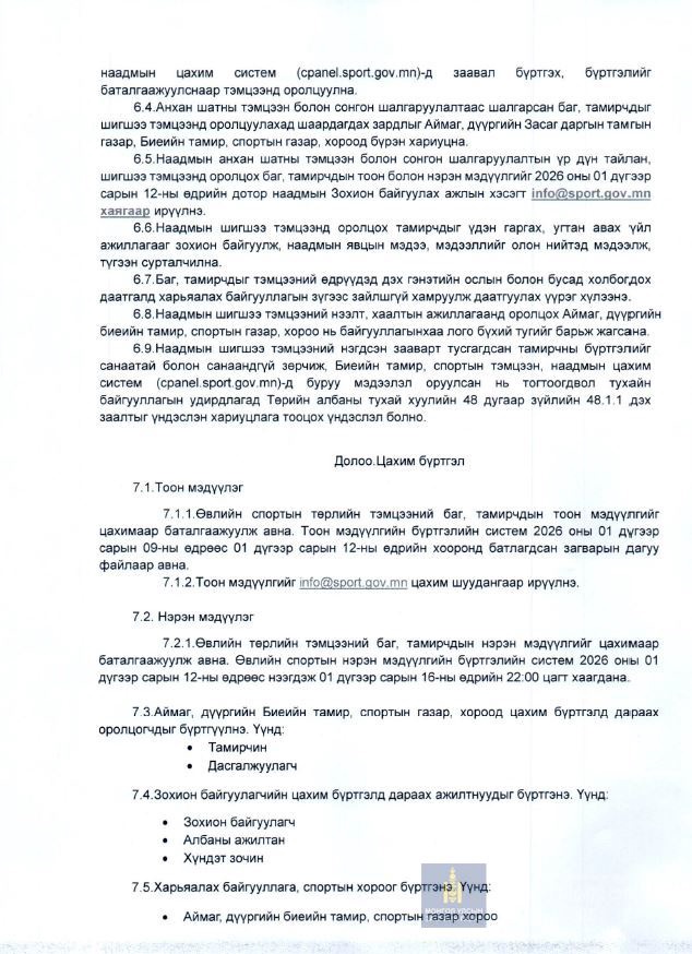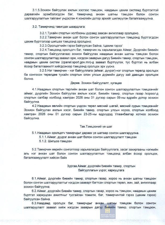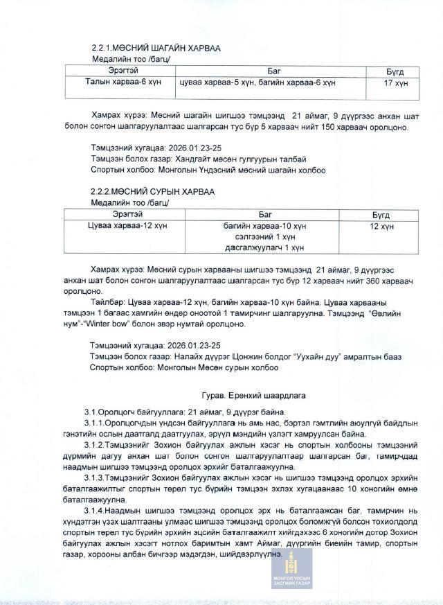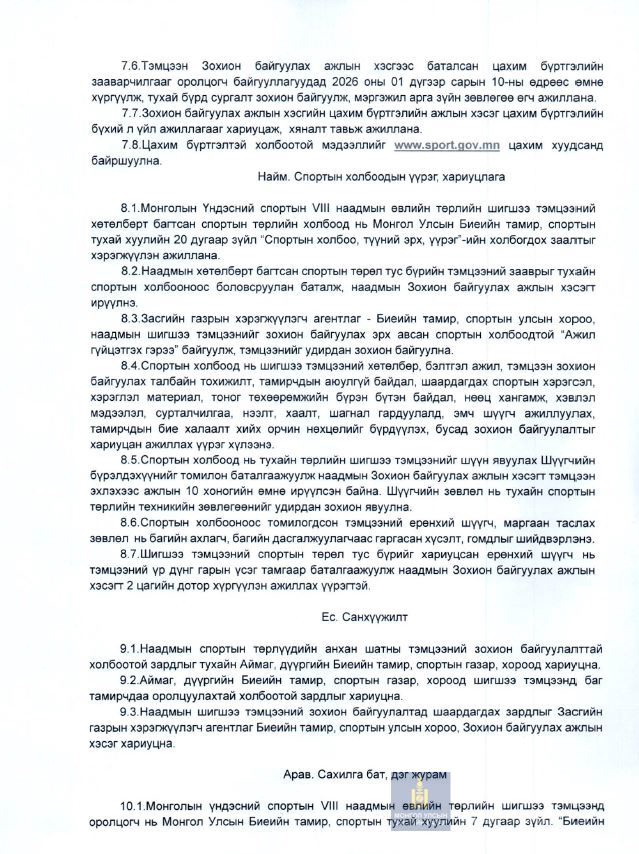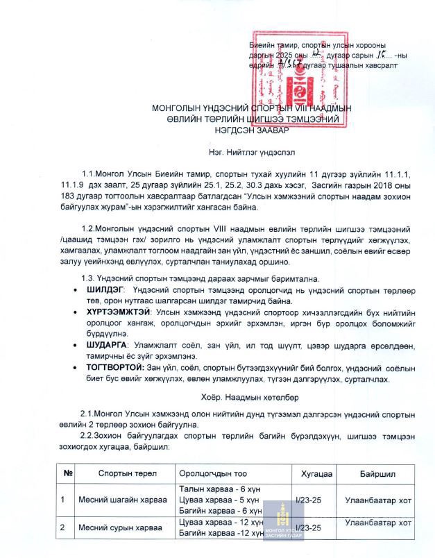 МОНГОЛЫН ҮНДЭСНИЙ СПОРТЫН VIII НААДМЫН ӨВЛИЙН ТӨРЛИЙН ШИГШЭЭ ТЭМЦЭЭНИЙ НЭГДСЭН ЗААВАР БАТЛАГДЛАА