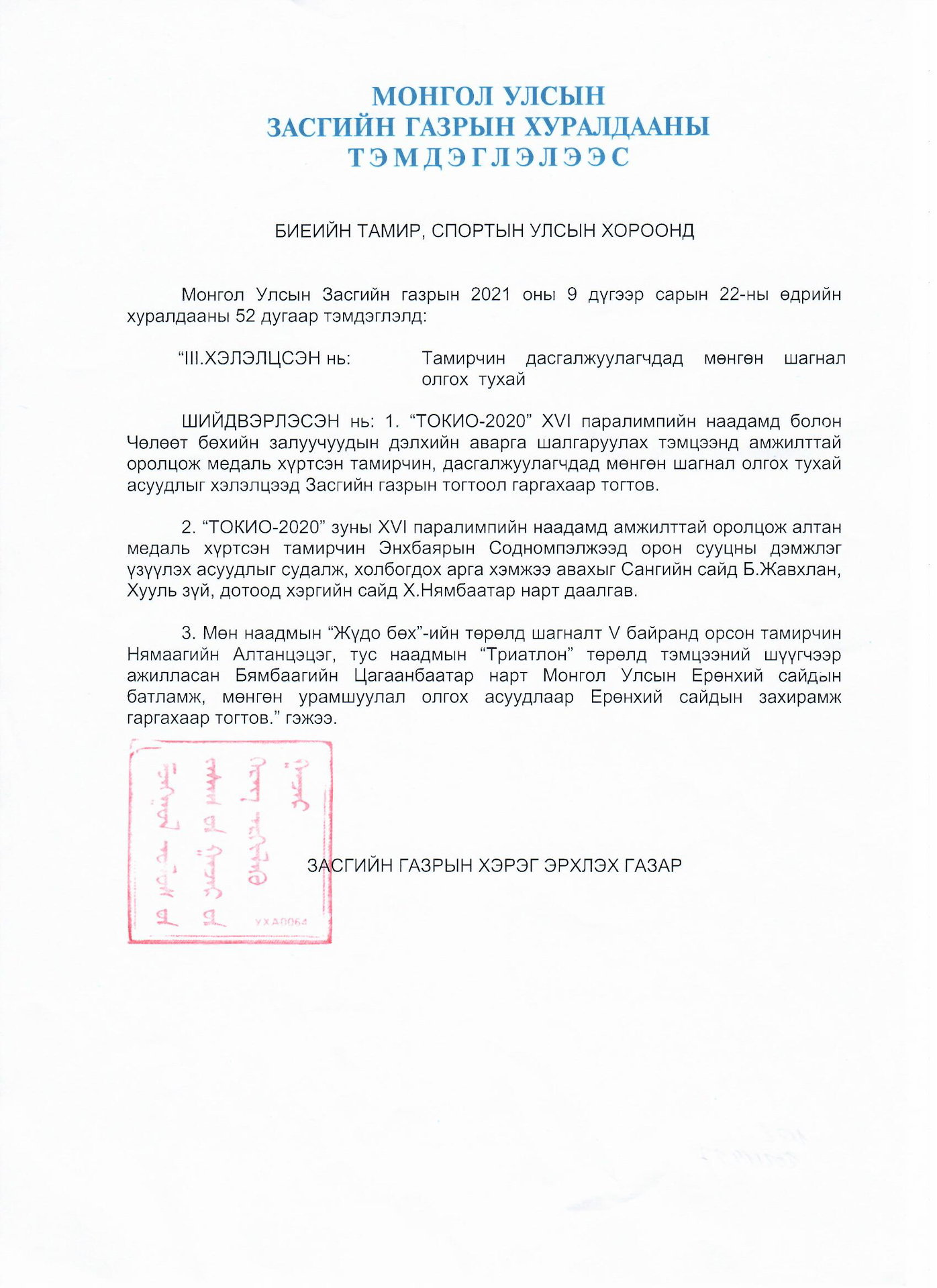 - Монгол Улсын Засгийн газрын хуралдааны тэмдэглэлээс "2021 оны 9 дүгээр сарын 22-ний өдөр 52 дугаар тэмдэглэлд"