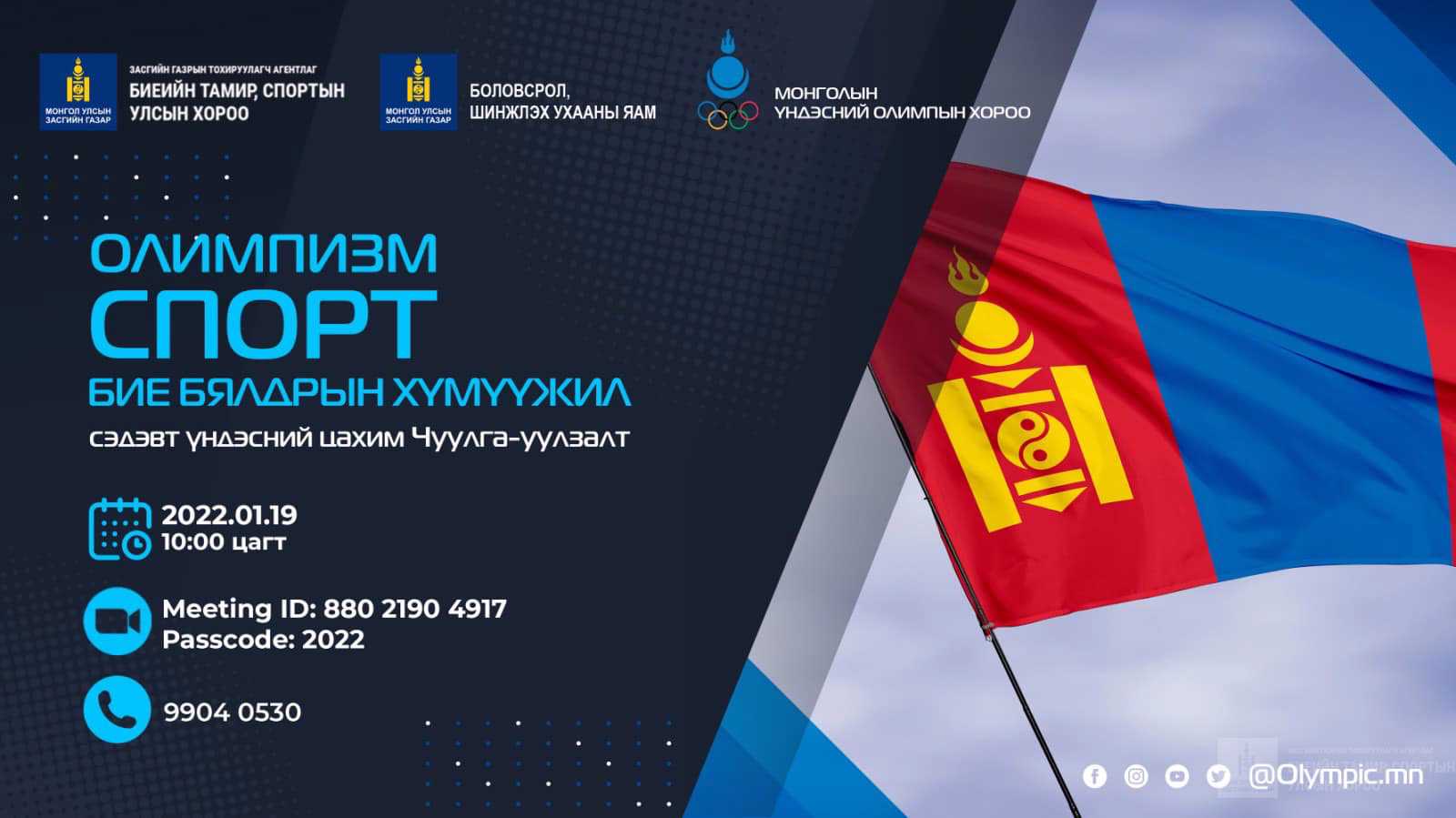 “Олимпизм-спорт-бие бялдарын хүмүүжил” сэдэвт үндэсний цахим чуулга уулзалтмаргааш 10:00 цагт болно. Энэ арга хэмжээг Биеийн тамир, спортын улсын хороо,Боловсрол, шинжлэх ухааны яам, Монголын үндэсний олимпын хорооноос зохионбайгуулж буй юм. Хэлэлцэх асуудал арвин байх нь лавтай. Уулзалтын хүрээнд олимзмба спорт, бие бялдарын хүмүүжлийн ажилд тулгамдаж буй асуудлыг онол, арга зүй,практикийн талаас хэлэлцэж, тодорхой үнэлэлт, дүгнэлт гаргах, харилцануялдаатай хөгжүүлэх, өв тэгш хөгжилтэй иргэдийг бэлтгэн гаргах ач холбогдолтойгцохон тэмдэглэе. Уулзалтанд аймаг, дүүргийн Боловсролын газар, хэлтсийнудирдлага, арга зүйч, мэргэжилтэн болон аймаг, дүүргийн Биеийн тамир, спортынгазрын удирдлага, мэргэжилтэн, дасгалжуулагч, олимпын зөвлөлийн удирдлага аргазүйчид оролцоно. Түүнчлэн ерөнхий боловсролын сургууль болон Олимпын танхмынзахирал, арга зүйч, биеийн тамирын багш, Төрөлжсөн сургалттай биеийн тамир, спортындунд сургуулийн удирдлага, багш, дасгалжуулагч, спорт клубуудын багш,дасгалжуулагч, цэрэг хүчний биеийн тамир, спортын байгууллагын удирдлага, багш,дасгалжуулагч, эрдэмтэн, судлаачид хамрагдах юм байна. Энэ үеэр БТСУХ-ны даргаЦ.Шаравжамц, Боловсрол шинжлэх ухааны сайд Л.Энх-Амгалан, МҮОХ-ны ерөнхийлөгчийнүүрэг гүйцэтгэгч Ч.Наранбаатар нарын хүндтэй хүмүүс оролцож, үг хэлнэ. Үүнийараас БТСУХ-ны Бодлого төлөвлөлтийн газрын дарга О.Гэрэл “Биеийн тамир, спортынулсын хорооноос явуулж буй бодлого ба арга хэмжээнүүд”, МҮОХ-ийн ерөнхийлөгчЧ.Зоригтбаатар “Монгол Улсын биеийн тамир, спорт ба олимзмын тулгамдсанасуудлууд” зэрэг итгэлүүд тавигдана