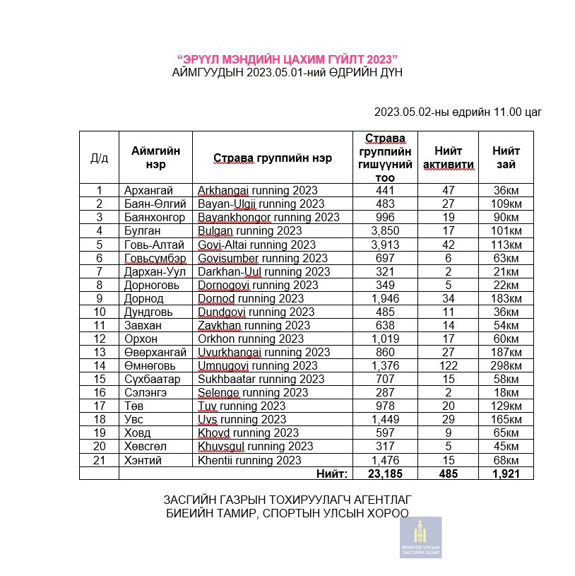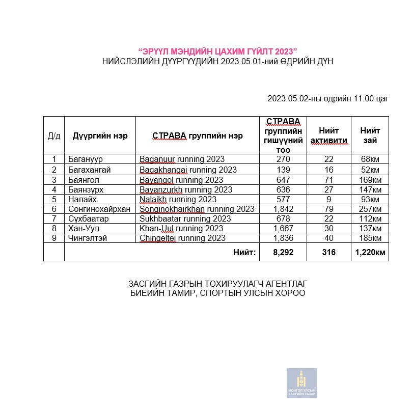 "Эрүүл мэндийн цахим гүйлт 2023" эхний өдрийн дүнг хүргэж байна. Пара ангиллын гүйлтийн дүнг долоо хоногийн нэгдсэн байдлаар хүргэнэ.