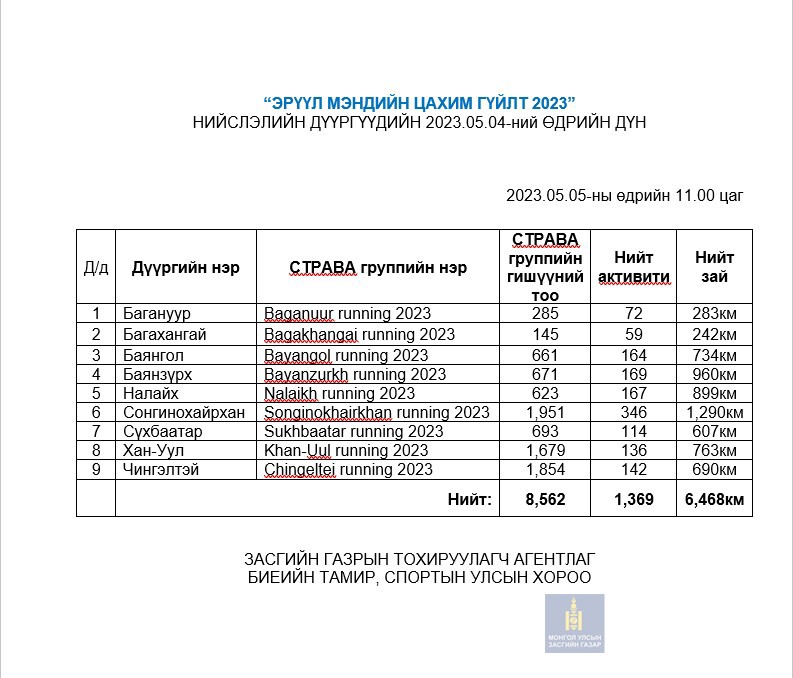 "Эрүүл мэндийн цахим гүйлт 2023" тавдугаар сарын 04-ний өдрийн байдлаар СТРАВА аппликейшнд 4452 гүйлт бүртгэгдэж, нийт 19,749 км замыг туулсан байна.
