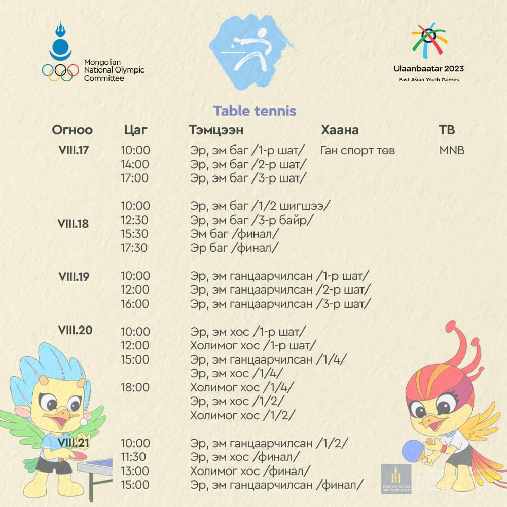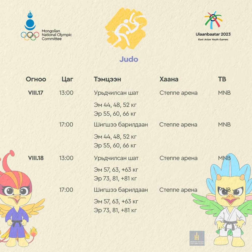 "Улаанбаатар-2023" Зүүн Азийн залуучуудын наадмын хуваарийг спортын төрөл тус бүрээр танилцуулья.