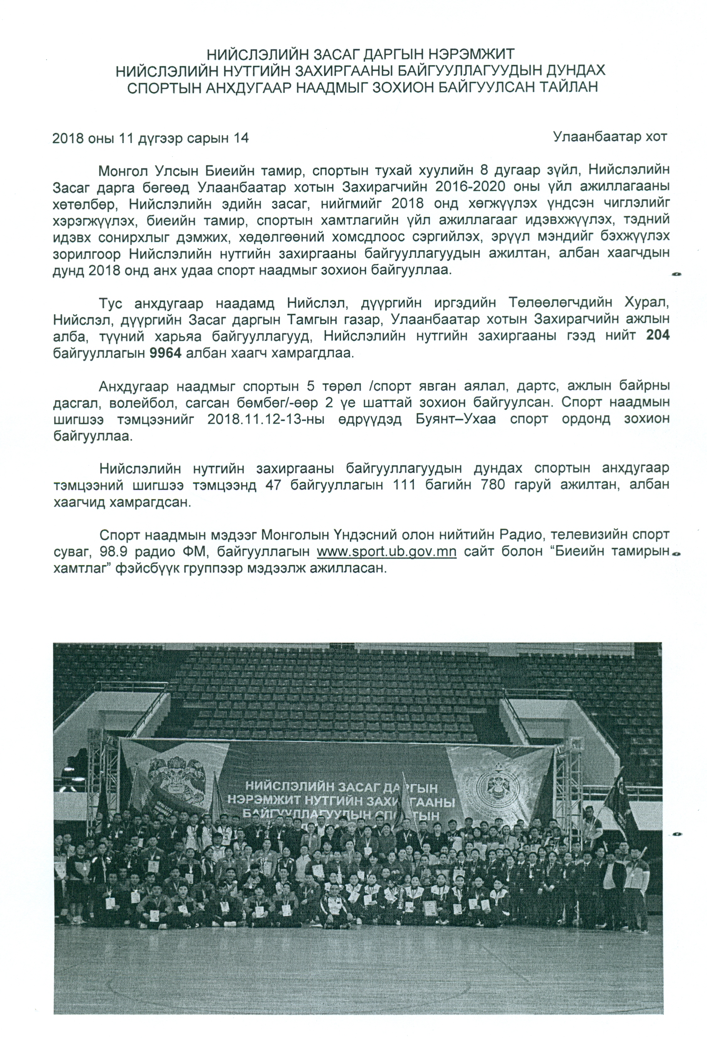 Анхдугаар наадмыгспортын 5 төрөл /спорт явган аялал, дартс, ажлын байрны дасгал, волейбол,сагсан бөмбөг/-өөр 2 үе шаттай зохион байгуулсан. Спорт наадмын шигшээ тэмцээнийг 2018.11.12-13-ныөдрүүдэд Буянт–Ухаа спорт ордонд зохион байгууллаа.