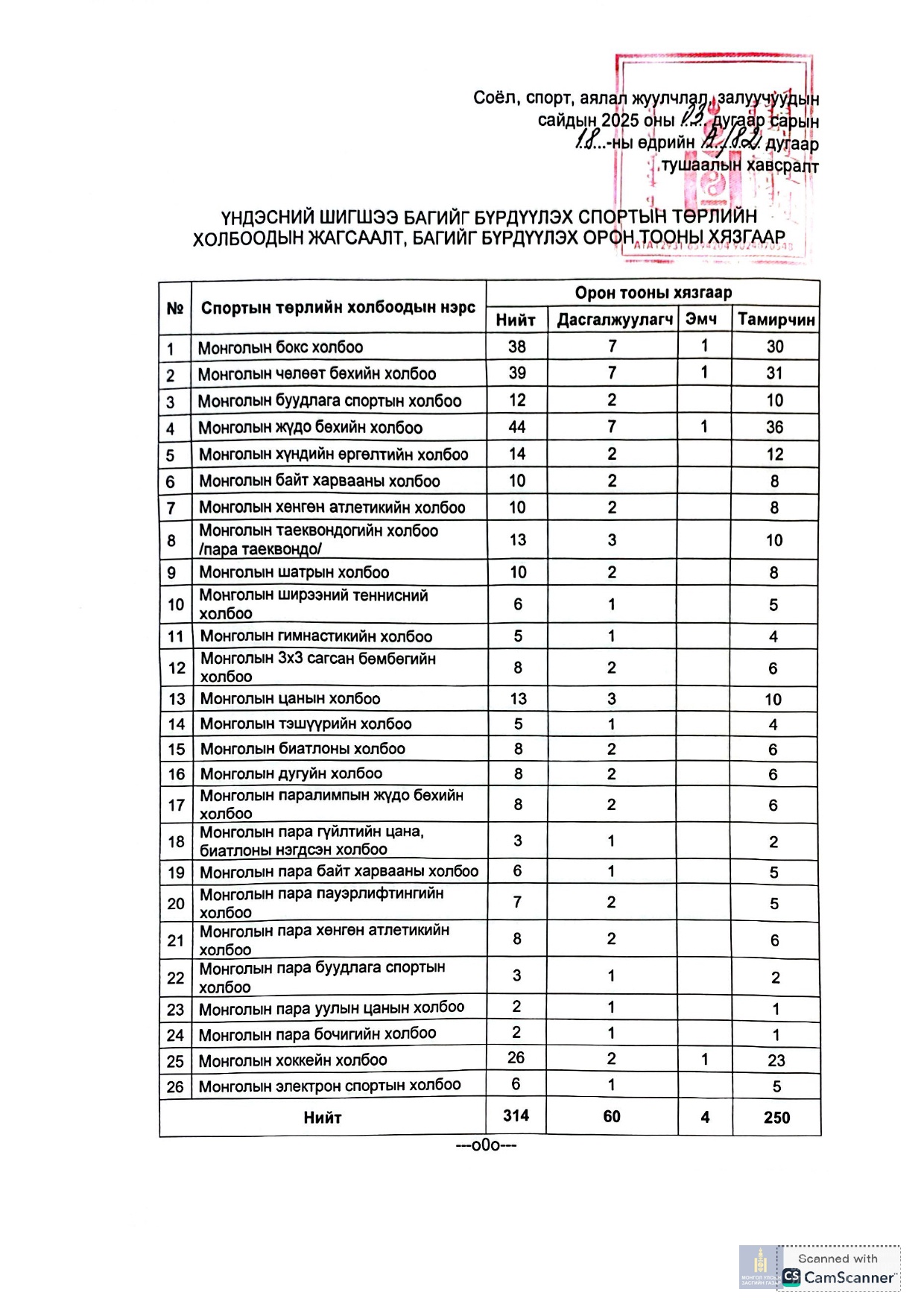 Спортын төрөл, орон тоо батлах тухай