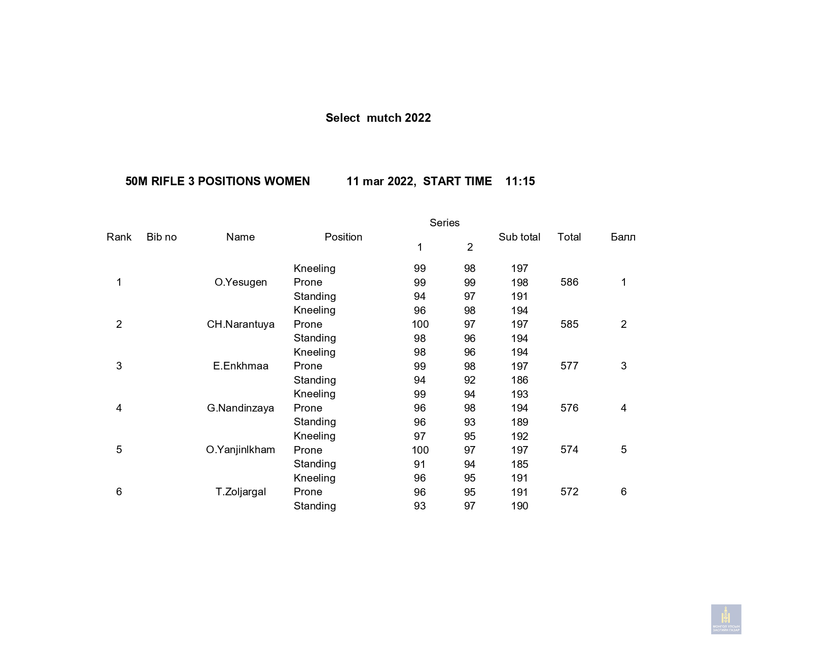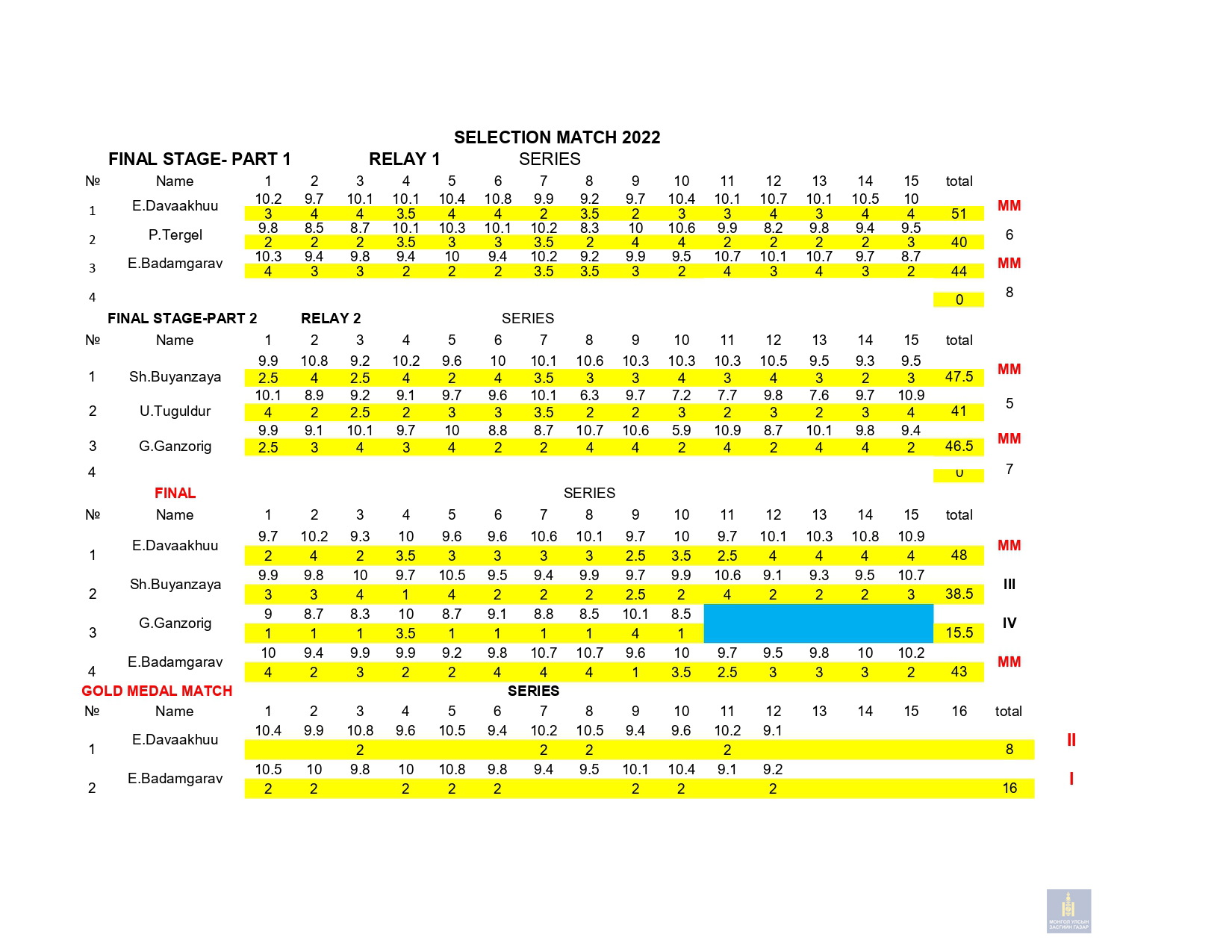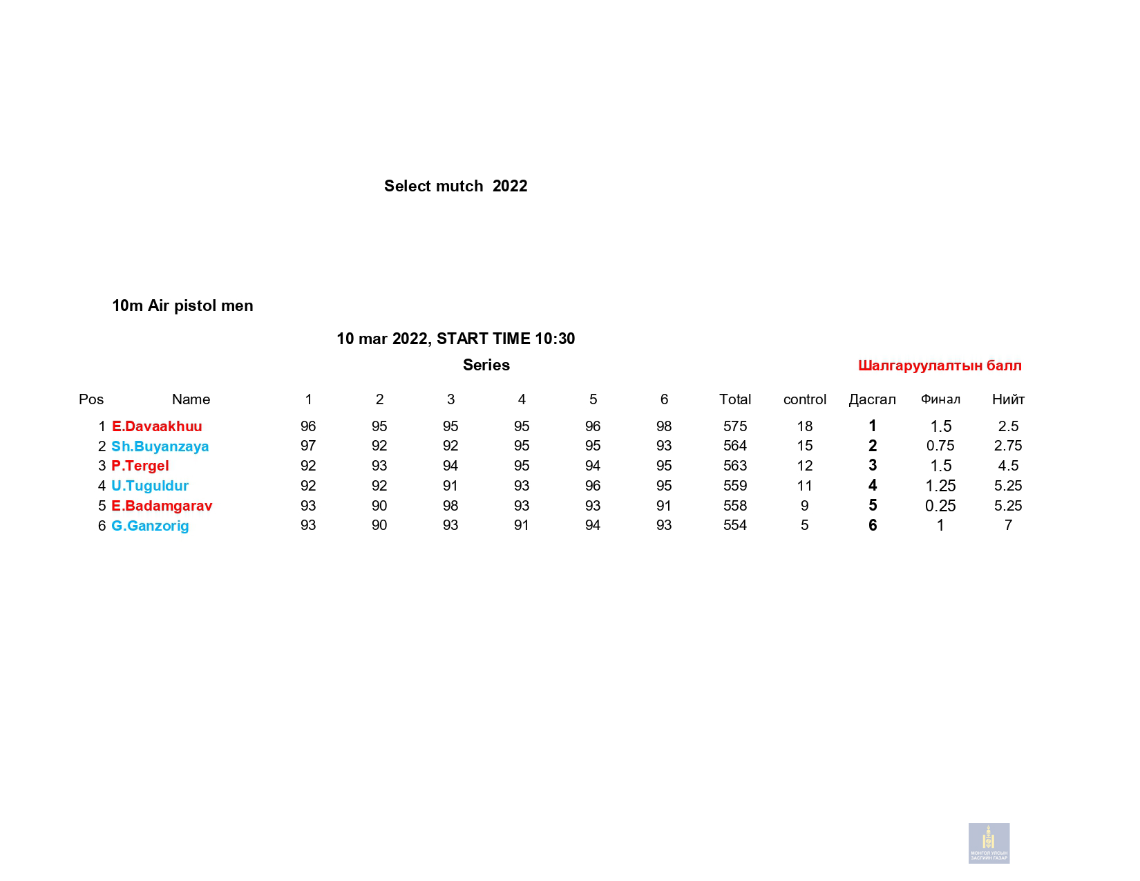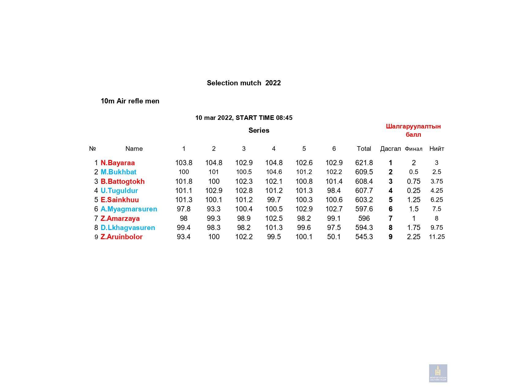 Сонгон шалгаруулалтын 1-р сорил: 2022 оны 03 дугаар сарын 10-ны Пүрэв гарагт 10м-ийн хийн гар буу , 03 сарын 11ны Баасан гарагт 50м-ийн урт бууны 3х20 дасгал, 03 сарын 12-ны Бямба гарагт 10м-ийн хийн урт бууны эрэгтэй, эмэгтэй дасгалуудаар сонгон шалгаруулалтын сорил авч дүн гарлаа.
