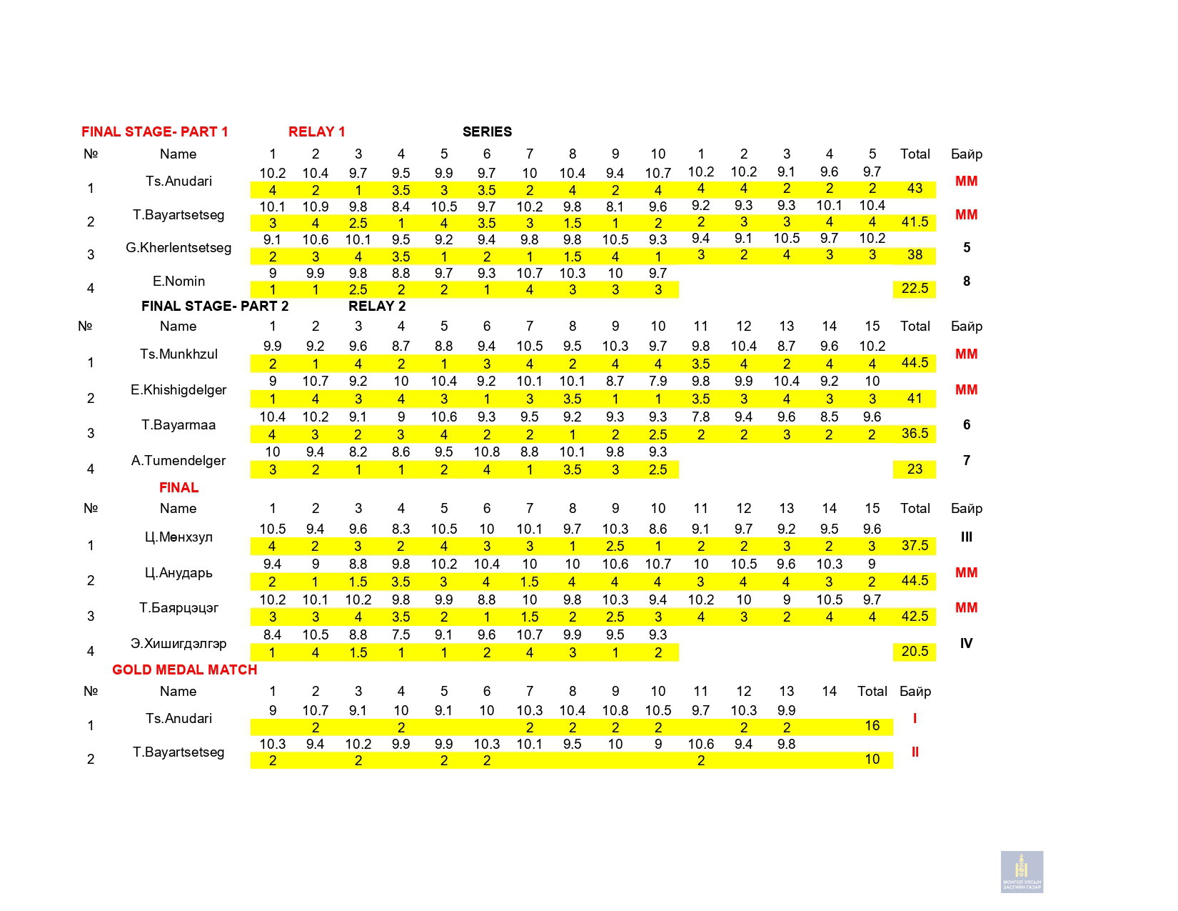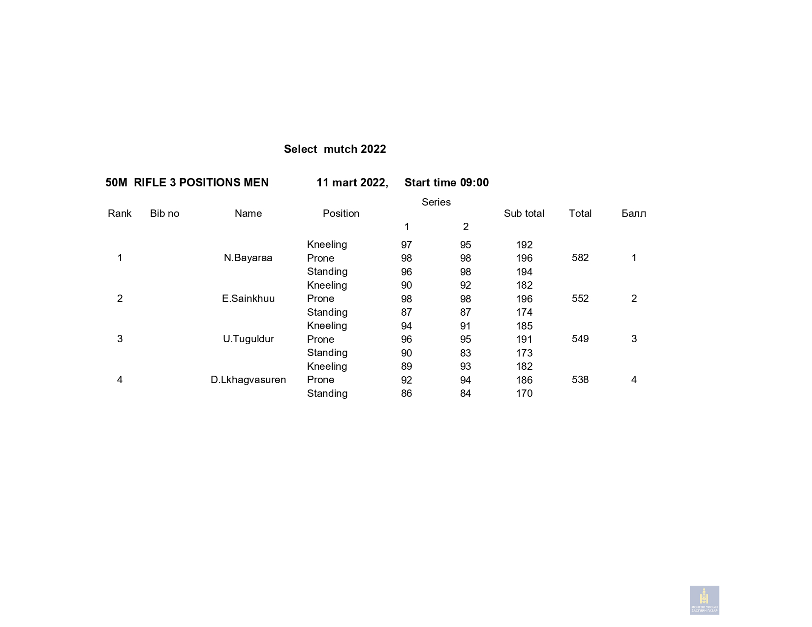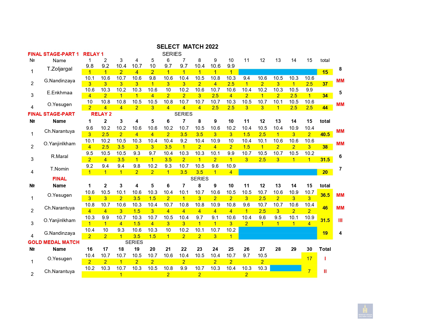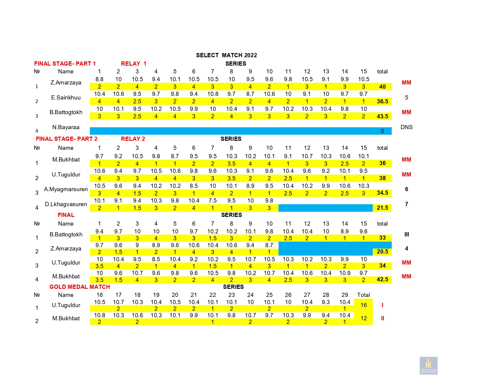 Сонгон шалгаруулалтын 1-р сорил: 2022 оны 03 дугаар сарын 10-ны Пүрэв гарагт 10м-ийн хийн гар буу , 03 сарын 11ны Баасан гарагт 50м-ийн урт бууны 3х20 дасгал, 03 сарын 12-ны Бямба гарагт 10м-ийн хийн урт бууны эрэгтэй, эмэгтэй дасгалуудаар сонгон шалгаруулалтын сорил авч дүн гарлаа.