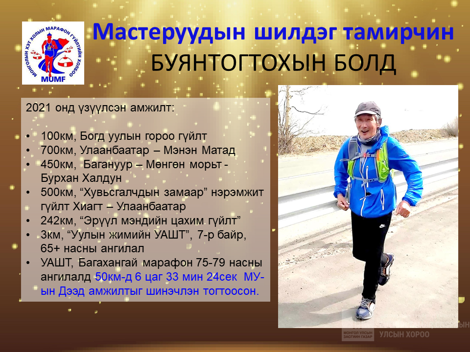 Монголын хэт холын марафон гүйлтийн холбооны “Шинэ жилийн цэнгүүн” 2021 оны 12 сарын 25-ны өдөр амжилттай болж, оны шилдгүүдээ шалгарууллаа.