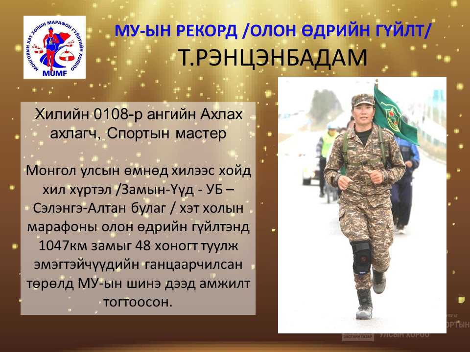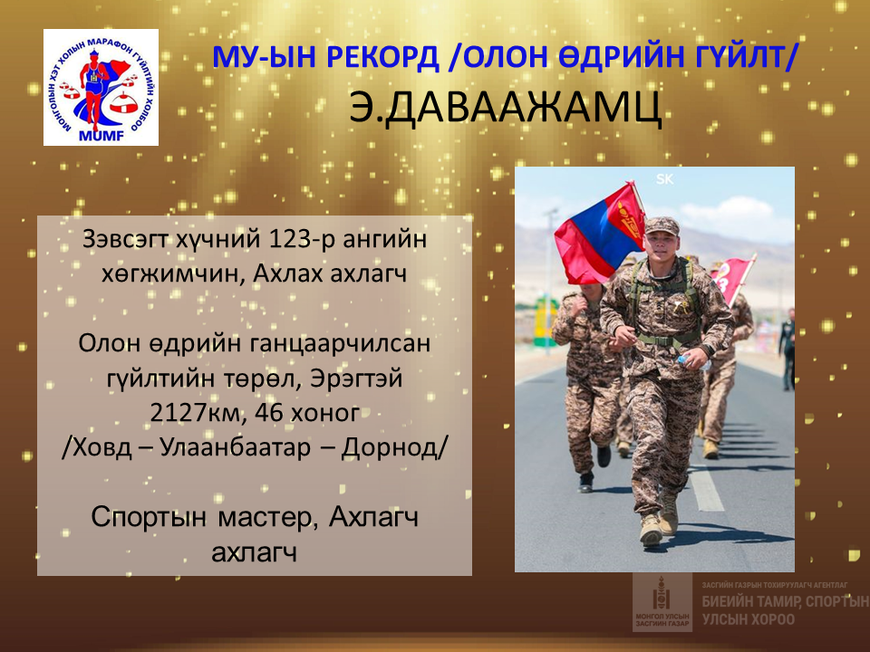 Зэвсэгт хүчний биеийн тамирын “Алдар” медалиар бэлтгэл хошууч, ОУХМ, холбооны ахмадын зөвлөлийн дарга Ч.Цогоо, "Алдар" спорт хорооны хөнгөн атлетикийн дасгалжуулагч, хошууч, Спортын мастер Х.Уянга нар,