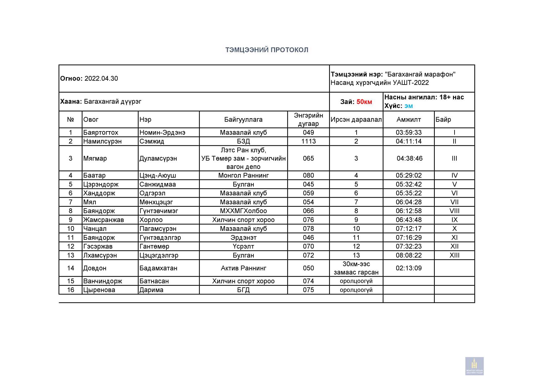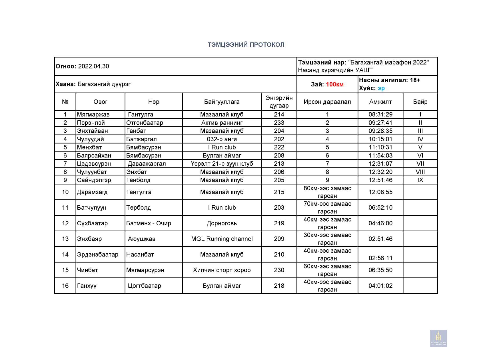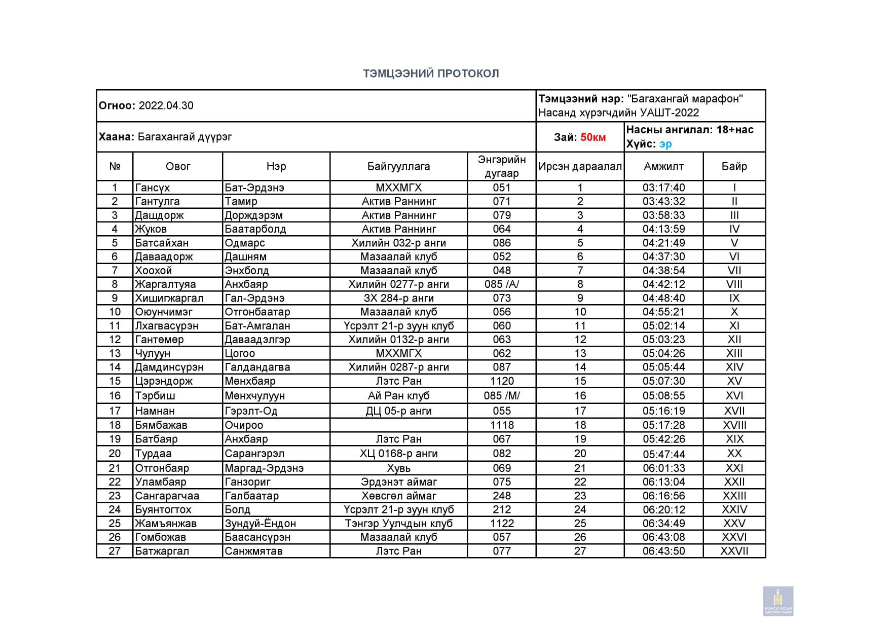 Багахангай 2022 - Насанд хүрэгчдийн УАШТ дүн