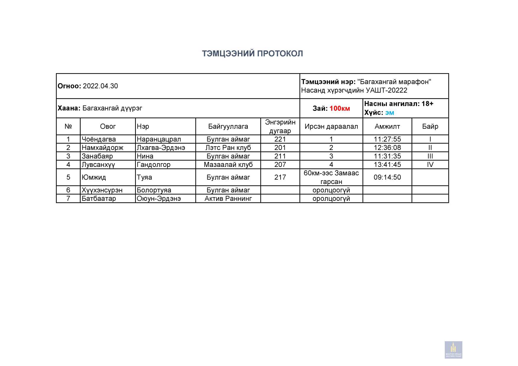 6/12/24 цагийн гүйлтийн Залуучууд, Ахмадын УАШТ