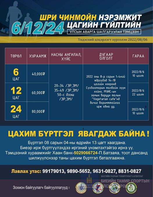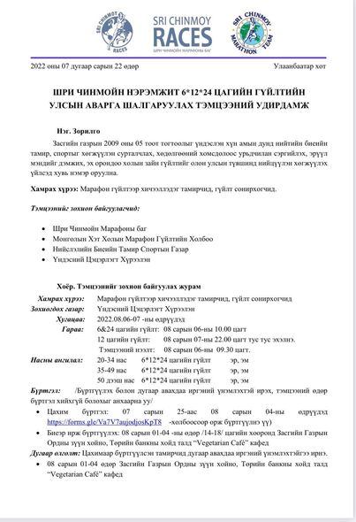 ШРИ ЧИНМОЙН нэрэмжит 6.12,24 цагийн гүйлтийн насанд хүрэгчдийн " УЛСЫН АВАРГА ШАЛГАРУУЛАХ ТЭМЦЭЭН " 2022.08.06 -ний өдөр болно. ТЭМЦЭЭНИЙ ЗААВАРТАЙ танилцана уу?