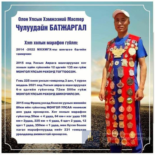 МХХМГХ-ны тамирчин, Монгол Улсын хэт холын гүйлтийн шилдэг гүйгчдийн нэг Ч.Батжаргал Улаанбаатар-Ховд,Үенч сум гүйлтээ 17 өдөрт 1700км туулж 2022.09.01-ний өдөр барианд орлоо