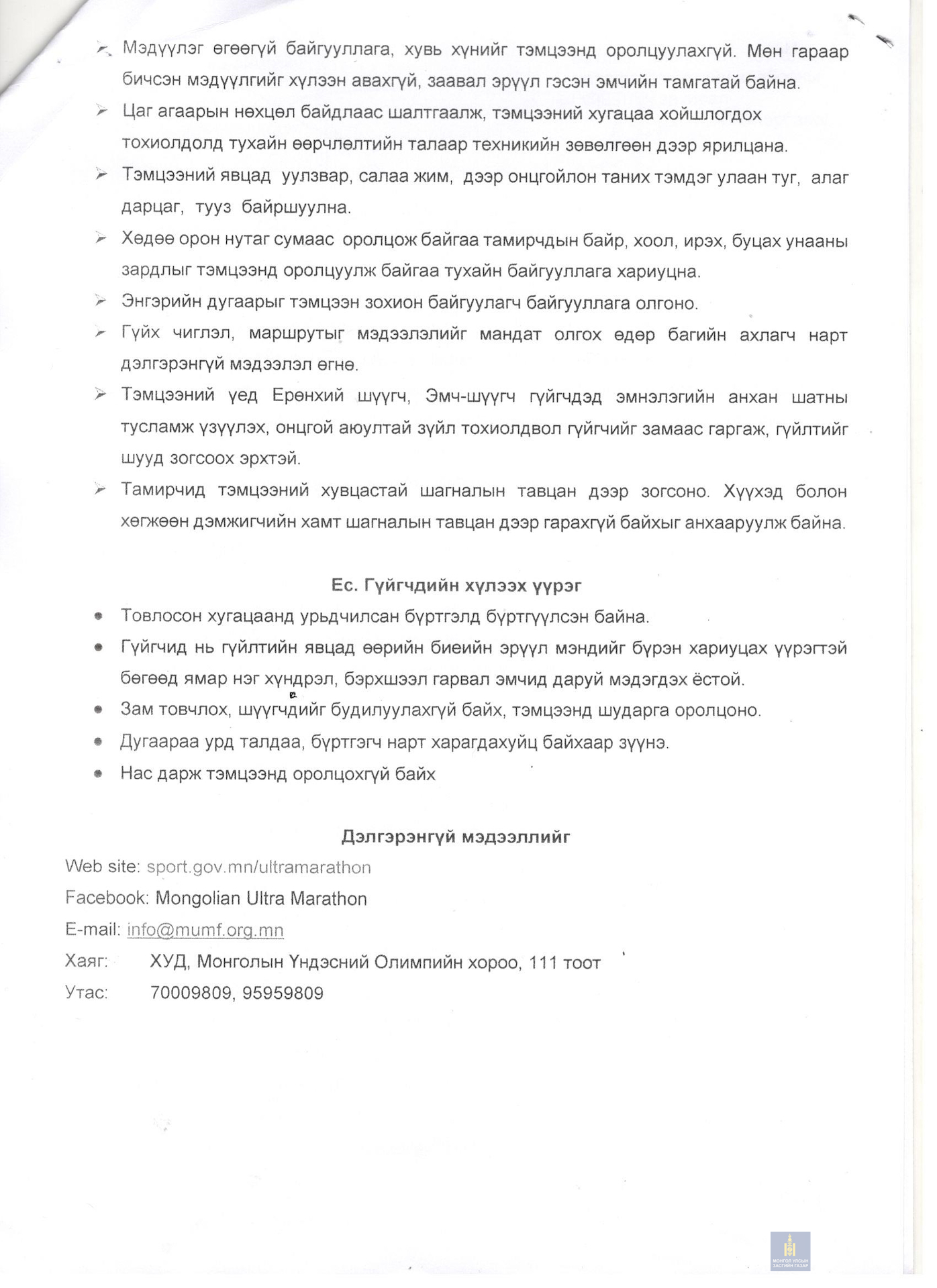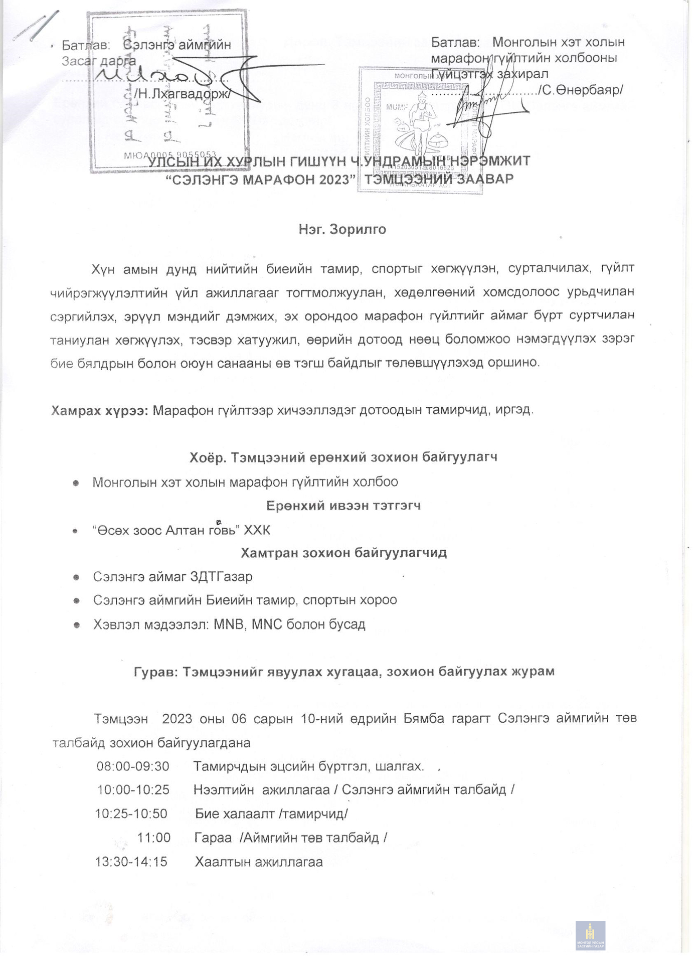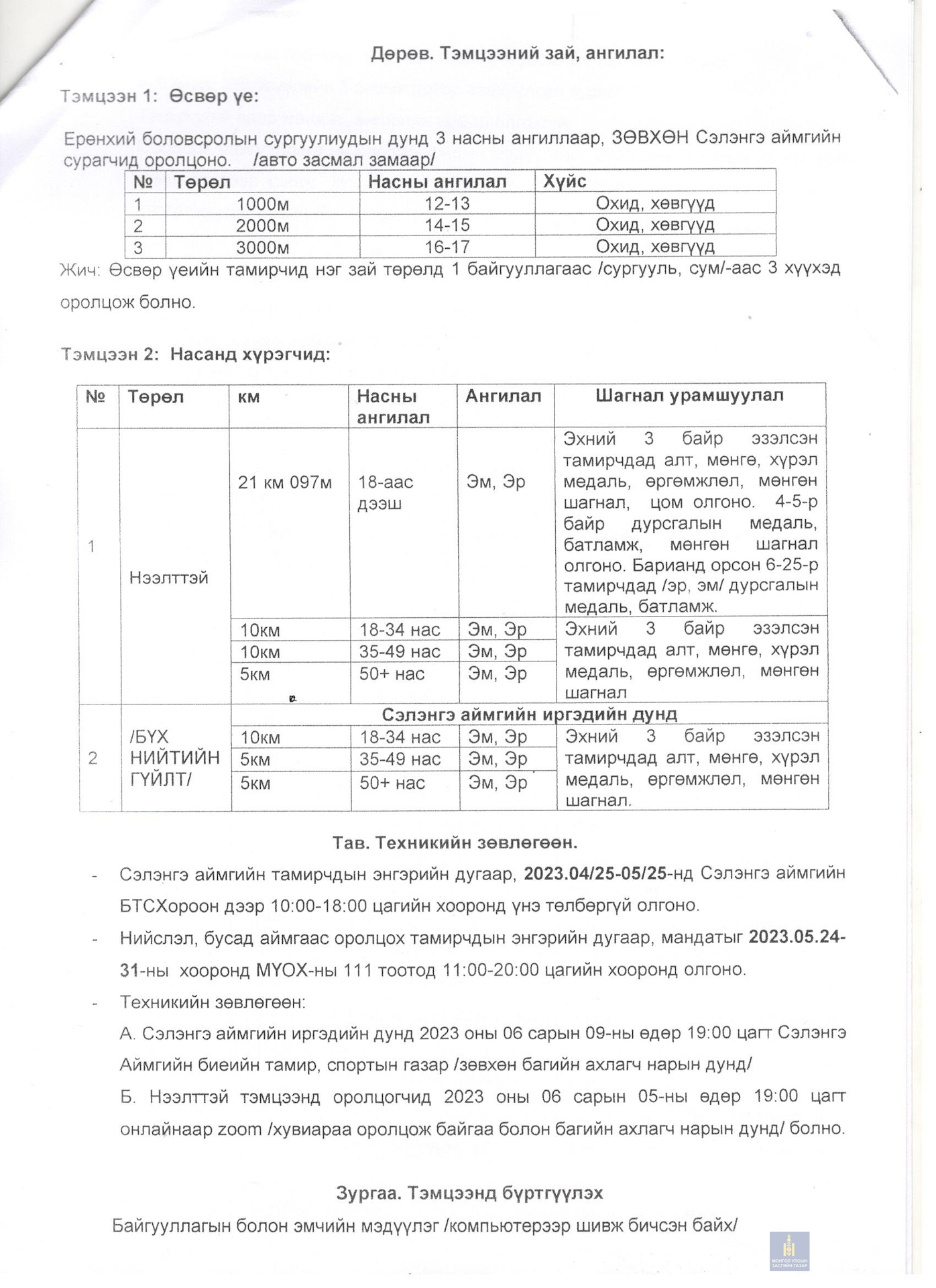 Тэмцээн 1: Сэлэнгэ аймгийн иргэдийн дунд зохиогдох /Өсвөр үеийн болон Бүх нийтийн гүйлт/ тэмцээний бүртгэл, энгэрийн дугаар, мандат олголтыг Сэлэнгэ аймагт Арга зүйч Л.Аззаяа хариуцан ажиллаж байна. Утас: 94219616