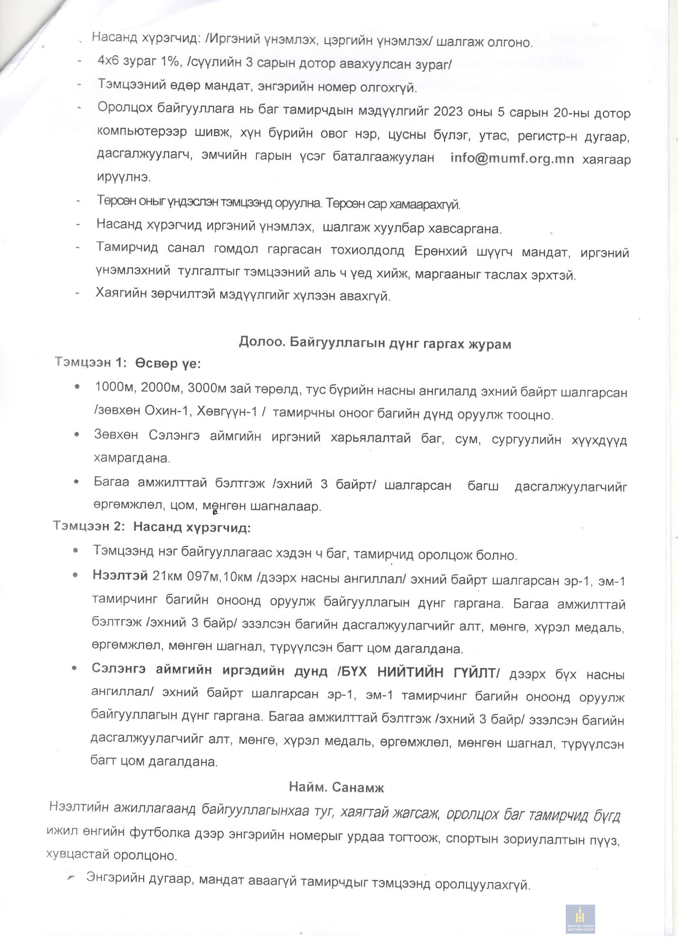 Тэмцээн 2: Улаанбаатар хот, бусад аймгаас #НЭЭЛТТЭЙ тэмцээнд оролцох тамирчид, гүйгчид https://forms.gle/mn5wGC9C6UaCtunHA линкээр бүртгүүлнэ үү. Бүртгэл 2023.05.30-нд хаагдана.