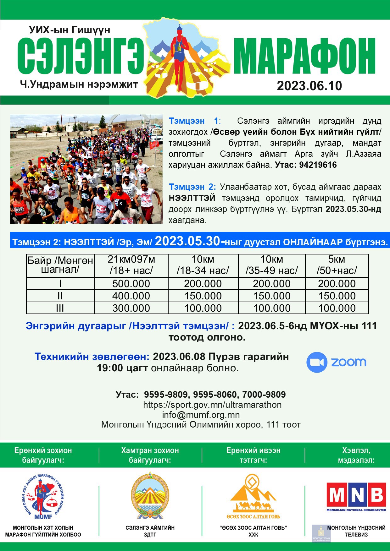 УИХ-ын Гишүүн Ч.Ундрамын нэрэмжит "Сэлэнгэ марафон" 2023.06.10-ны өдөр 2 дахь жилдээ Сэлэнгэ аймагт зохион байгуулагдах гэж байна. Тамирчид, гүйлтээр хичээллэгч та бүхнийг өргөнөөр оролцохыг уръя.